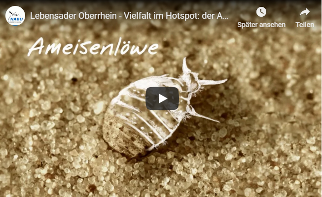 Ein Löwe am Oberrhein? Ja! Der Ameisenlöwe ist eine von vielen außergewöhnlichen Tier- und Pflanzenarten, die im Biodiversitäts-„Hotspot“ zu Hause sind. Auch er profitiert vom Projekt „Lebensader Oberrhein – Naturvielfalt von nass bis trocken“, mit dem der NABU und viele Partner sich für die biologische Vielfalt am Oberrhein einsetzen. Der dritte Lebensader Oberrhein-Filmclip stellt das kleine Raubtier vor – und zeigt an diesem Beispiel, warum es so wichtig ist, die Lebensräume „von nass bis trocken“ zu erhalten.